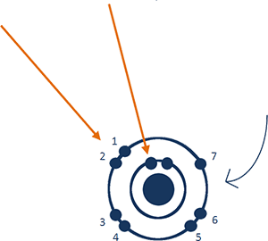 Nine electrons (white) occupy available electron shells (rings). In metals, and in many other solids, the atoms are arranged in regular arrays called crystals.
